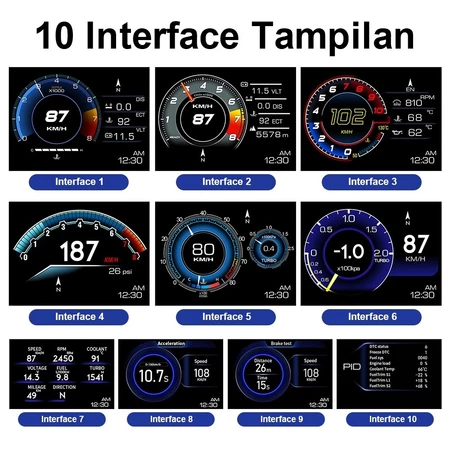 Menampilkan informasi: kecepatan kendaraan, suhu air, tegangan, konsumsi bahan bakar, RPM, jarak tempuh tunggal, total akumulasi jarak tempuh, waktu mengemudi, waktu sistem, tekanan masuk, suhu oli, rasio udara-bahan bakar, tekanan turbo, tekanan masuk, uji akselerasi, rem tes, Baca aliran data.