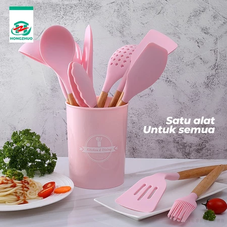 Spesifikasi Hongzhuo Silicone Utensil 11Pcs+Wadah Spatula Peralatan Masak Sutil Pegangan Kayu Baking Set Alat Ma