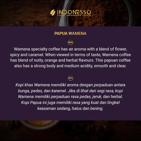 Dari ketinggian 1200 - 1600 mdpl Lembah Baliem kopi Papua Wamena berasal. Kopi Wamena memiliki perpaduan yang balance dan smooth, sensasi rempah/herbal dan jeruk dengan tingkat acidity/keasaman yang rendah serta smokey hint aftertaste. Kondisi penanaman yang tidak menggunakan pestisida atau senyawa kimia apapun menghasilkan aroma bernuansa floral dan cokelat yang harum.