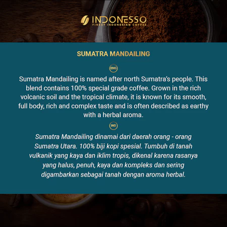 Sumatra Mandailing dinamai dari daerah orang-orang Sumatra Utara. Ini adalah 100% biji kopi spesial grade. Tumbuh di tanah vulkanik yang kaya dan iklim tropis, dikenal karena rasanya yang halus, penuh, kaya dan kompleks dan sering digambarkan sebagai tanah dengan aroma herbal.