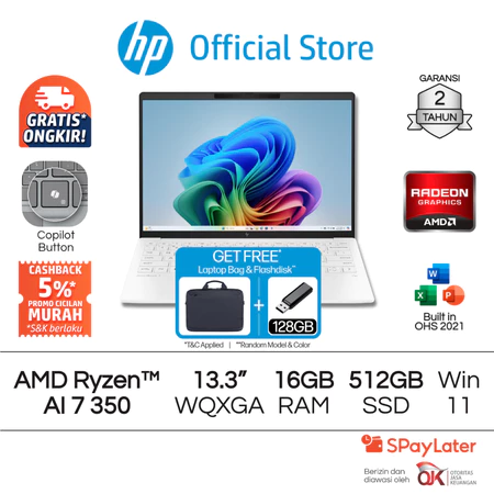 Spesifikasi Laptop HP Pavilion Aero - OmniBook 7 Aero [NEW] AMD Ryzen AI 7 Radeon 860M 16GB RAM 512GB SSD Silver / White Free Windows 11 HP Komputer Official Store