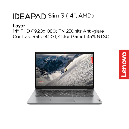 Spesifikasi Lenovo IdeaPad Slim 3 14AMN8 AMD Ryzen 3 7320U Win11 8GB 512GB SSD 14" FHD TN 45% NTSC Antiglar