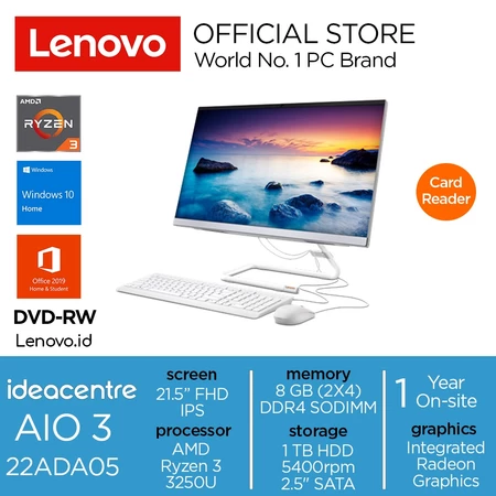 Lenovo PC IdeaCentre AIO 3 22ADA05 (AMD Ryzen 3 3250U, Win10 Home, 8GB DDR4-2400, 1TB HDD SATA 5400rpm, 21.5" FHD IPS, Integrated AMD Radeon Graphics, DVD RW) + Wired Keyboard & Mouse (berkabel) + OHS 2019 + Packing Kayu